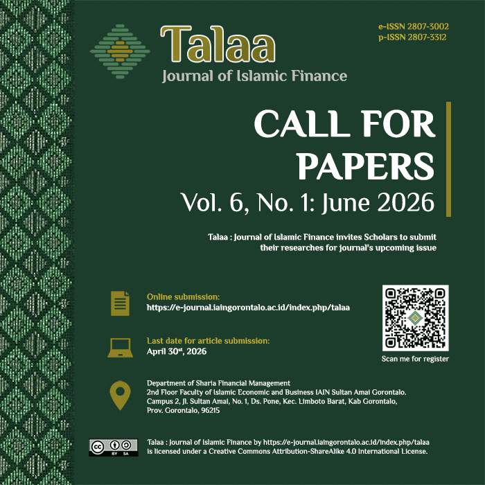 Talaa : Journal of Islamic Finance is published by the Islamic finance management department of the State Islamic Institute (IAIN) Sultan Amai Gorontalo Indonesia. This journal is published twice a year, namely in June and December. All submitted articles will go through a review process and the results of the review will be published after obtaining approval from the reviewer. Published articles are publicly accessible online and free to download. And as our initial commitment to globalize Islamic finance, all articles published in this journal are in English.