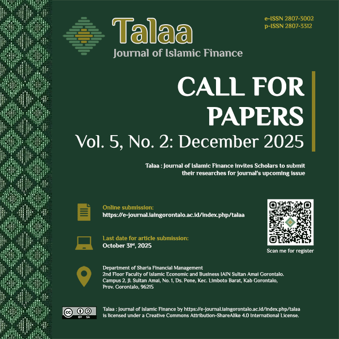 Talaa : Journal of Islamic Finance is published by the Islamic finance management department of the State Islamic Institute (IAIN) Sultan Amai Gorontalo Indonesia. This journal is published twice a year, namely in June and December. All submitted articles will go through a review process and the results of the review will be published after obtaining approval from the reviewer. Published articles are publicly accessible online and free to download. And as our initial commitment to globalize Islamic finance, all articles published in this journal are in English.